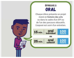 Dans le cadre du DNB, les élèves doivent passer une épreuve orale qui consiste à présenter un des objets d’étude abordés au cours du cycle 4 (de la 5e à la 3e). Il s’agit de projets menés dans le cadre des EPI (enseignements pratiques interdisciplinaires), de l’un des parcours éducatifs (parcours avenir, parcours citoyen, parcours santé et parcours d’éducation artistique et culturelle) ou de l’histoire des Arts.